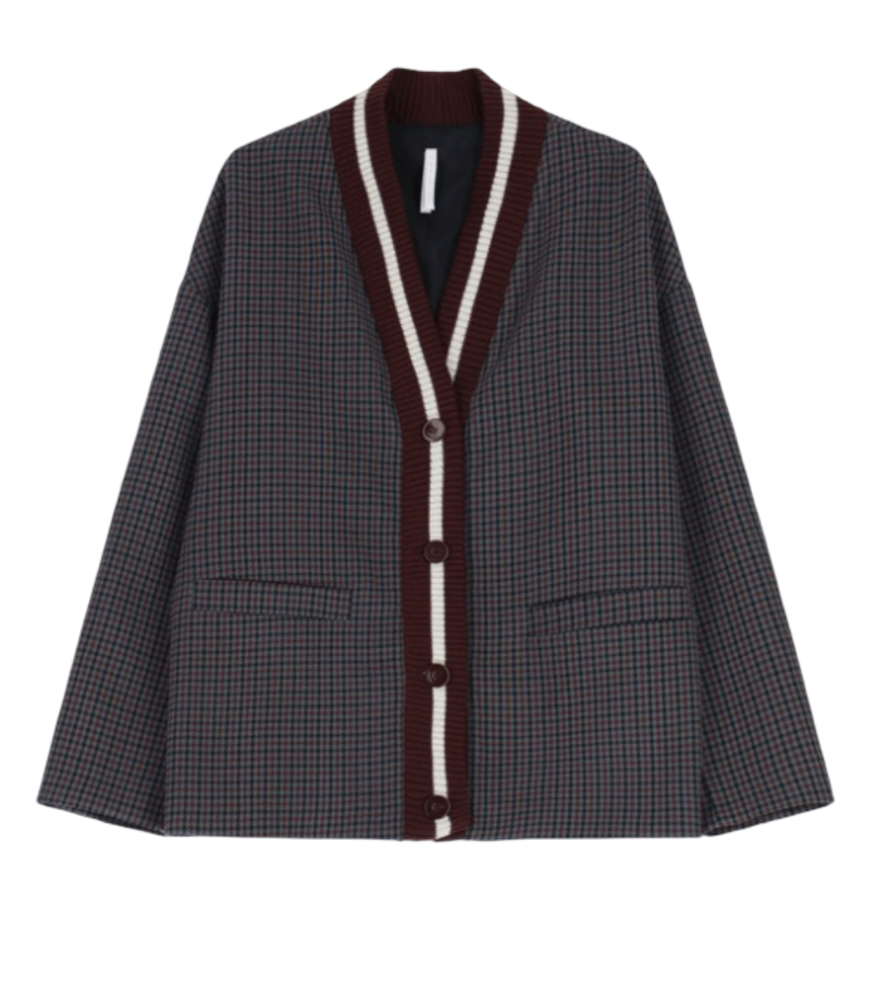 Blazer à la coupe moderne, orné d’un motif carreaux et de bordures côtelées contrastantes, fermé par un boutonnage simple. Sa silhouette ample et ses poches plaquées incarnent une allure distinctive, idéale pour sublimer les tenues formelles et affirmer sa personnalité.