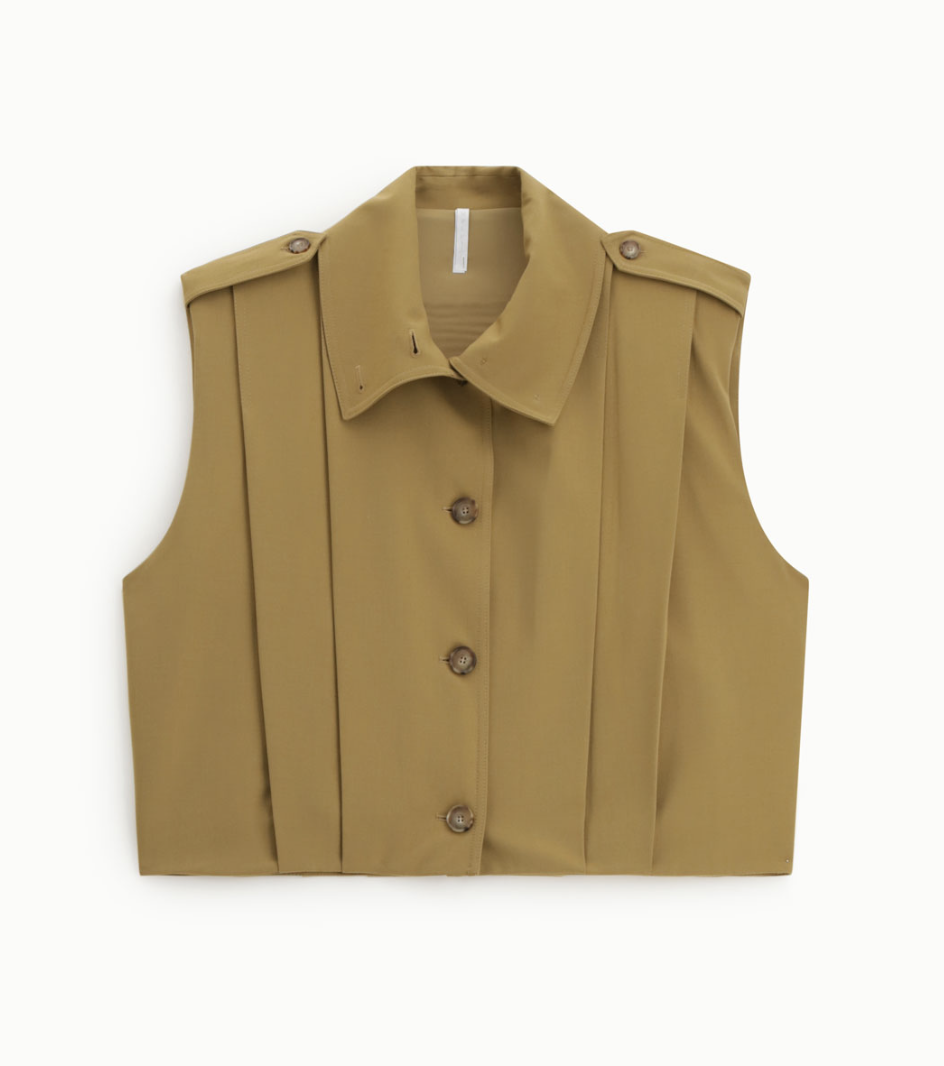 Gilet court à coupe géométrique, dotée d’épaulettes et de plis verticaux pour une allure affirmée. La fermeture boutonnée sur le devant souligne la précision de sa construction et s’intègre aisément à des tenues urbaines sophistiquées.
